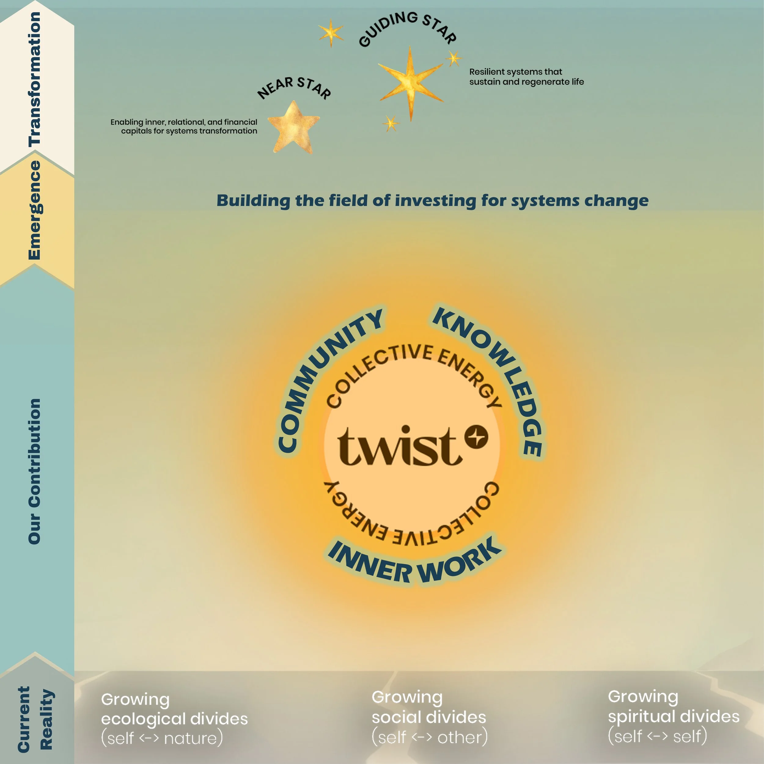 Our Theory of Transformation is our roadmap for shifting capital toward systemic change. By weaving together knowledge, community, and inner work, we help build the field, and support investors in moving from the divides of today towards a regenerative future.